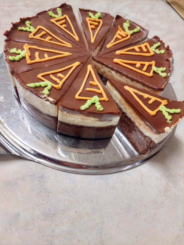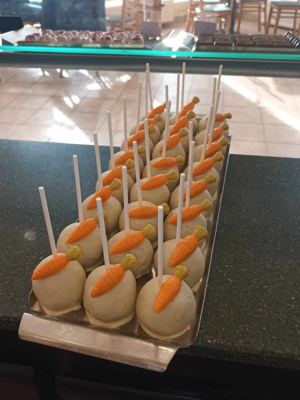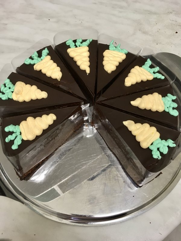 ZÁKUSEK K VYZVEDNUTÍ POUZE 29.3.-1.4.2024 Mrkvový korpus s krémem z cream cheese a pomeranče. Obalený bílou čokoládou s filigránem (1,5,7)