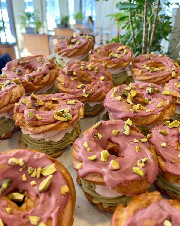ZÁKUSEK K VYZVEDNUTÍ POUZE 29.3.-1.4.2024 Věneček se speciální náplní (pistácie a maliny) zdobený ruby čoko a drcenými pistáciemi. (1,3,7,8)
