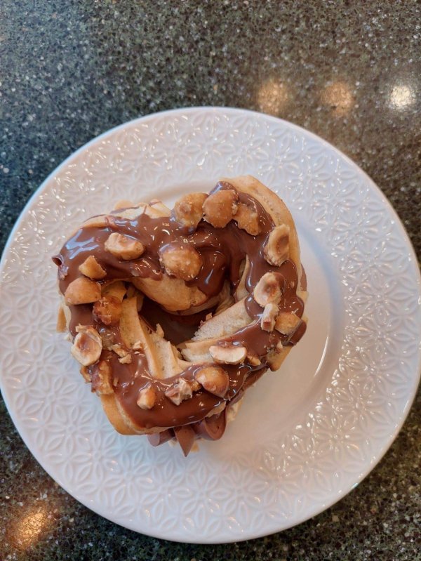 Odpalované těsto naplněné pudinkovo-šlehačkovým krémem a karamelovou šlehačkou, ozdobený karamelovým fondánem.