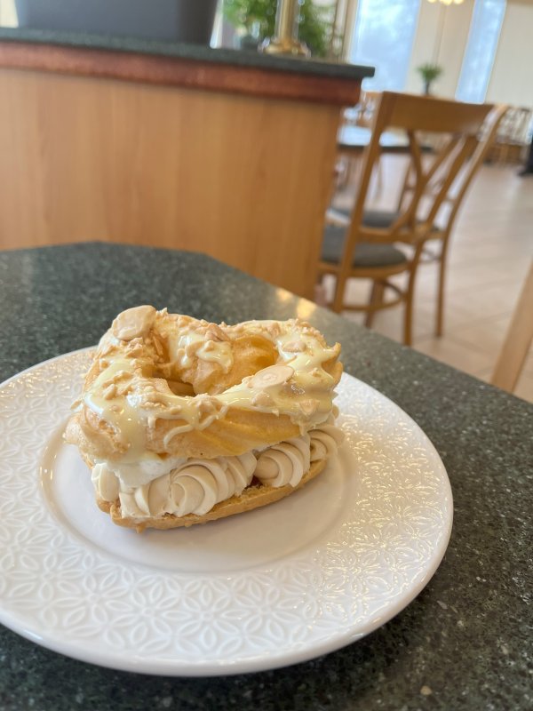 ZÁKUSEK K VYZVEDNUTÍ POUZE 29.3.-1.4.2024 Věneček se speciální náplní (mandle ze Sicílie a naše šlehačka) zdobený bílou čoko a mandlemi foto ilustrativní: k vyzvednutí bude kulatý tvar (věneček) (1,3,6,7,8)
